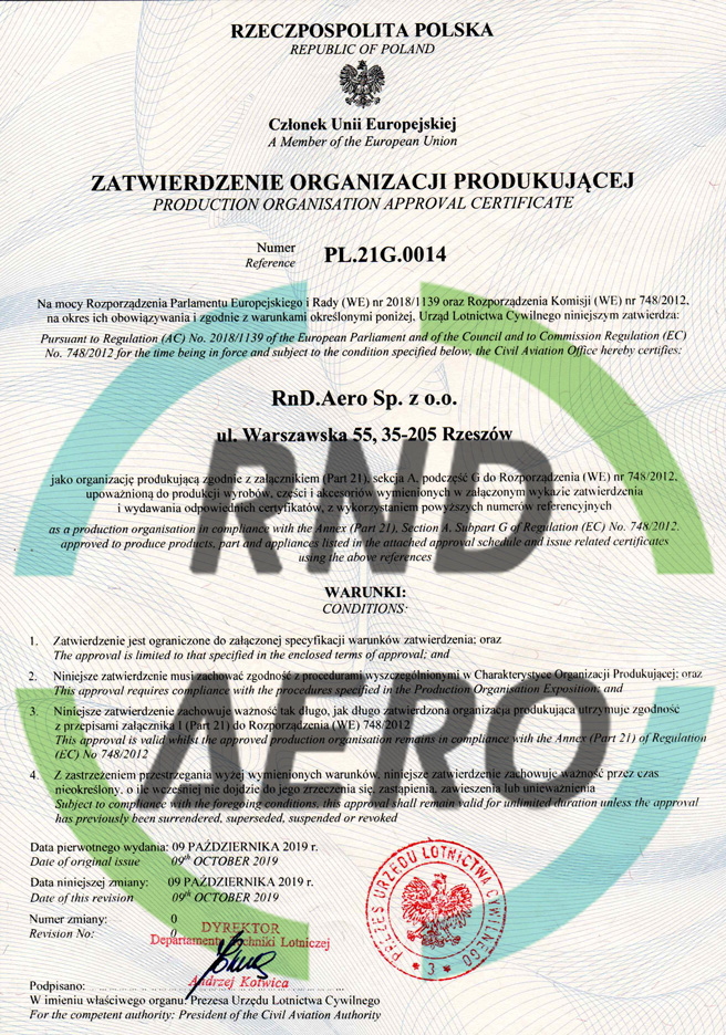 RnD.Aero produkuje najwyższej jakości części lotnicze, co dowodzi posiadany przez nas certyfikat EASA Part 21G – Zatwierdzonej Organizacji Produkującej (POA). Certyfikat został nadany przez Urząd Lotnictwa Cywilnego i umożliwia nam produkcję części lotniczych. Części lotnicze opuszczają RnD.Aero wraz z dokumentem EASA Form 1. Wyprodukowane przez RnD.Aero części mogą dzięki temu trafić na pokład samolotów lotnictwa cywilnego.